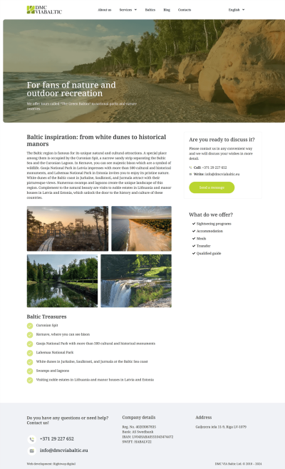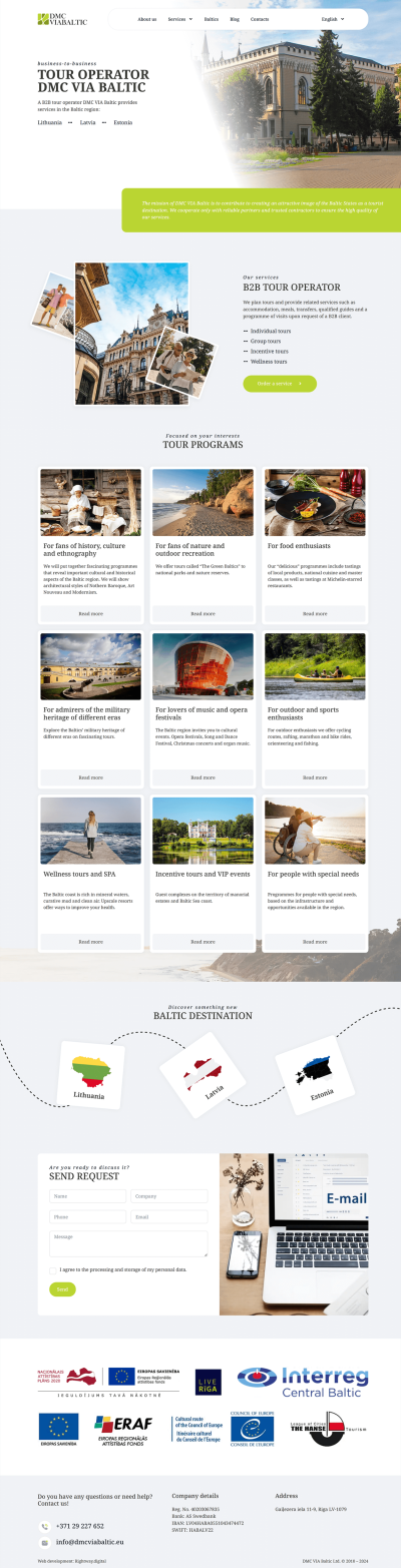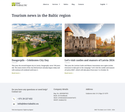 Туристическое агентство DMC VIA Baltic предоставляет услуги клиентам зарубежных турфирм (В2В) в регионе Балтийского моря: в Литве, Латвии и Эстонии. Миссия DMC VIA Baltic – обеспечивать широкий спектр программ, индивидуальный подход к каждому клиенту и высокий уровень обслуживания.