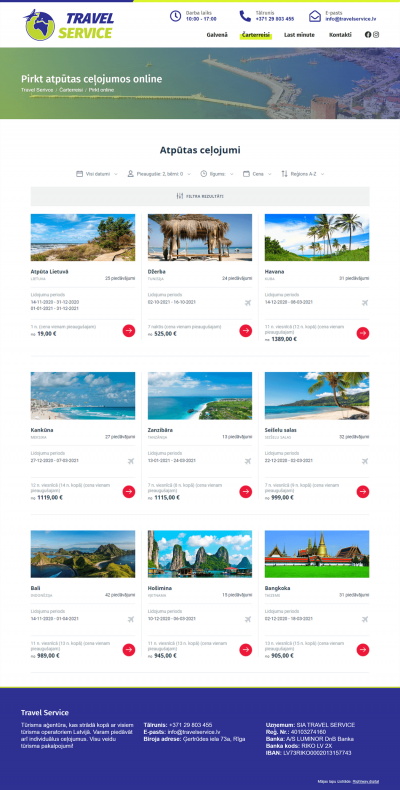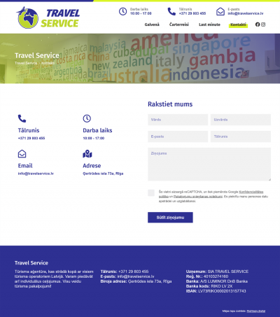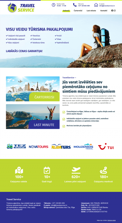 Туристическое агентство, которое работает вместе со всеми туроператорами Латвии. TravelService предоставляет все виды туристических услуг, а также индивидуальные предложения. Всегда открыты как для страстных путешественников, так и для новичков.